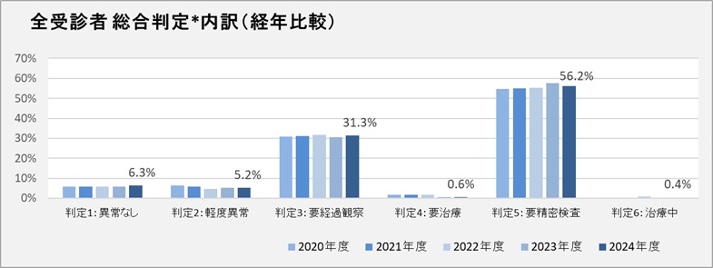 2024年度のデータによると、受診者のうち「判定5:要精密検査」に該当した方は56.2%にのぼりました。つまり、受診された方の2人に1人が、何らかの項目でより詳細な調査が必要な状態であるといえます。