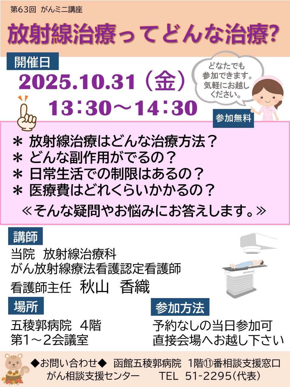 【イベント】がんミニ講座「放射線治療ってどんな治療?」開催のお知らせ(2025年10月31日) 開催日2025年10月31日(金) 時 間13時00分~14時30分 場 所函館五稜郭病院 4階 第1~2会議室 参加費無料 対 象どなたでも参加可能 お申込み予約なしの当日参加可 直接会場へお越しください お問合せ函館五稜郭病院 1階⑪相談支援窓口 がん相談支援センター TEL 51‐2295(代表)