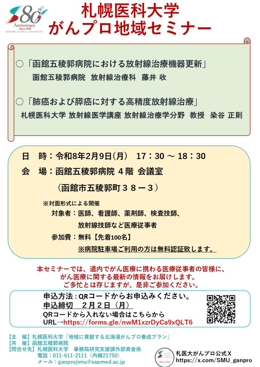 【イベント】札幌医科大学がんプロ地域セミナー開催のお知らせ(2/9月) 開催日2026年2月9日(月) 時 間17時30分~18時30分 場 所函館五稜郭病院4階会議室 (五稜郭町38-3) 参加費無料 対 象医療従事者 お申込み【外部リンク】申込フォーム