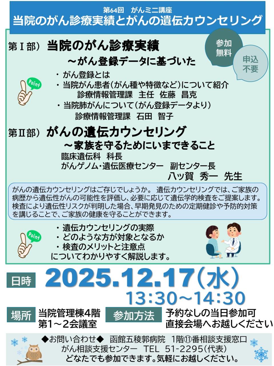 函館五稜郭病院 > お知らせ > イベント情報 > 【イベント】がんミニ講座「当院のがん診療実績とがんの遺伝カウンセリング」開催のお知らせ(2025年10月31日)