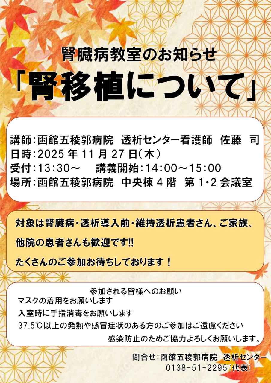 【イベント】腎臓病教室~腎移植について~(11/27木)開催のお知らせ 開催日2025年11月27日(木) 時 間開場 13時30分 開始 14時00分 終了 15時00分 場 所函館五稜郭病院 管理棟4階 第1・2会議室 参加費無料 対 象どなたでも参加可能 お申込み不要、当日直接会場にお越しください。 お問合せお問い合わせは下記の電話番号までお知らせください 函館五稜郭病院 透析センター TEL 0138-51-2295
